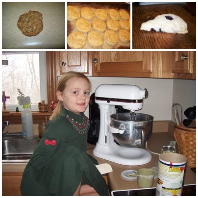 So we have stayed home..the kids and I love to watch the Food Network. We love Paula Deen, Rachel Ray, Barefoot Contessa..the list goes on. So Camye and I decided to try out some goodies. Recipes are at the end. The top right is our Vanishing Oatmeal Chocolate Chip cookies, then our Buttermilk Biscuits and our first attempt at Blueberry Scones (which Camye did the whole thing and they were AWESOME) Great job Camye!! We watched a show on how to make scones and Camye kept saying Now Mommy the key to a perfect scone is not mix it much, which is what they kept saying on the show.