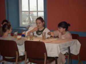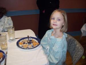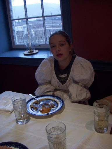 There lunch consisted of  Salted Pork, Carrot Pudding, Gravy, Bread and Apple Tarts. Camye did not eat the Salted Pork. 😉