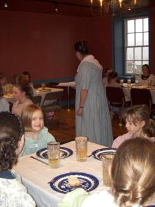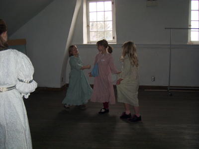 Yesterday the girls participated in a wonderful program called Windows thru History. This is something that is offered once a month and different time periods are studied each month. Obviously this month was Lewis and Clark. It was at the Vicary Mansion in Freedom, PA. They had alot of fun.:) As soon as they got there, they were taken to the 3rd floor to pick out there dress for the day. That was really neat to see all their dresses. Chloe had hoped for a white dress, trimmed in gold with puffed sleeves like Anne of Green Gables and that is what she got. Camye was too much of a hurry to get a dress on and get down to her friends.