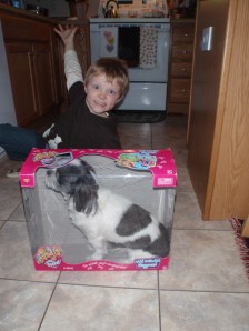 Like I said ….they are loved!! Paul LOVES them..I mean LOVES them…he is sooo close to both of them!!! Maybe because he was only 6 months old when we got them…but his entire day is based on what the dogs are doing. But lately I think Penny maybe wanting to change her idenity, in hopes of keeping Paul away..!!! I found Penny in this box….Paul said she wanted to be a “Puppy in His Pocket”….hmmmmm. Highly Doubtful!!