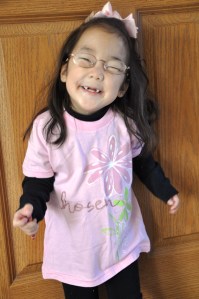 Aunt Kimberly, Uncle Tom, and cousins Alycia, Elizabeth, Austin and Amelia got Mia a cute tshirt that says CHOSEN for her birthday. Mia turned to the back to show me that it says, Deutronomy 14:2-2 For you are a holy people to the LORD your God, and the LORD has chosen you to be a people for His own possession out of all the peoples who are on the face of the earth. This adorable tshirt came from www.wildolives.com. Great adoption website! And the shirt is so correct, she was chosen for our family by God.