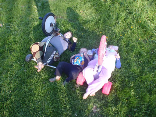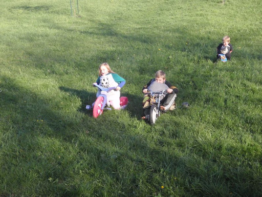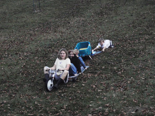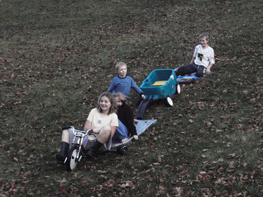 My kids are very creative. And when they have alot of time on their hands, you never know what fun they will come up with!! Sorry the pictures are so dark but it was almost dark!:) They tied together 2 sleds, 1 big wheel and the wagon?? They had a blast for hours!!!