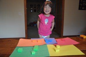 Here is one of the activities that she had to get started on immediatly. And of course my little social butterfly is always ready for a picture!!! She is matching little foam shapes to the coordinating colored page. Here is my little ‘tot’….sorting her little colored bears into colored cups. Her hair is pulled up….not cut!;) Couldnt cut those curls!:)