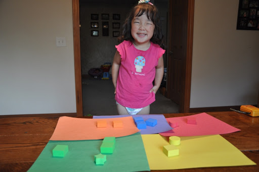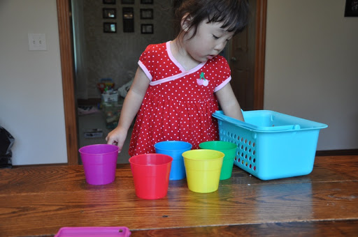 Here is one of the activities that she had to get started on immediatly. And of course my little social butterfly is always ready for a picture!!! She is matching little foam shapes to the coordinating colored page. Here is my little ‘tot’….sorting her little colored bears into colored cups. Her hair is pulled up….not cut!;) Couldnt cut those curls!:)